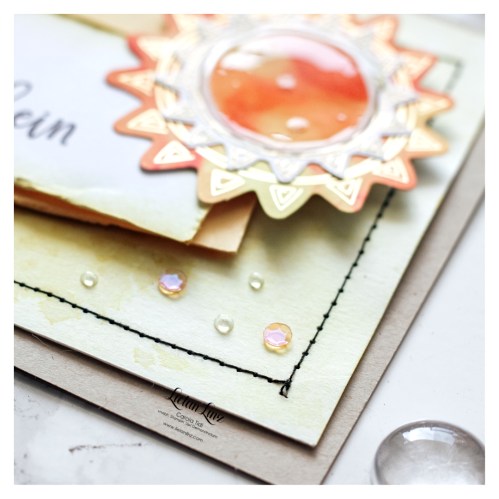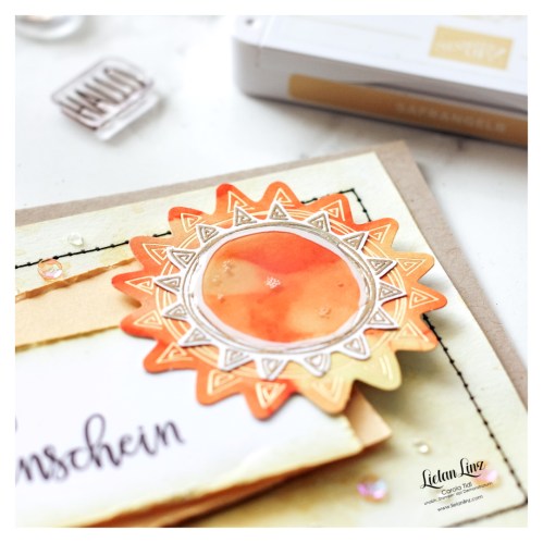 Genauso wie die Dekoration, die 2. Sonne (in gold embosst und per Hand ausgeschnitten) und die Pailletten. Zum Schluss hab ich mich noch mit dem Präzisionkleber ausgetobt.