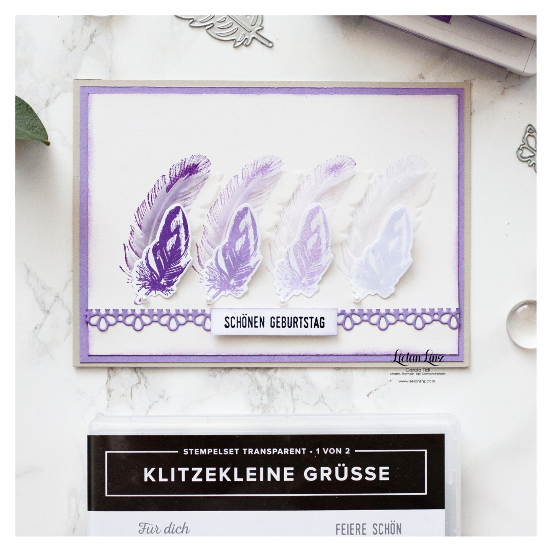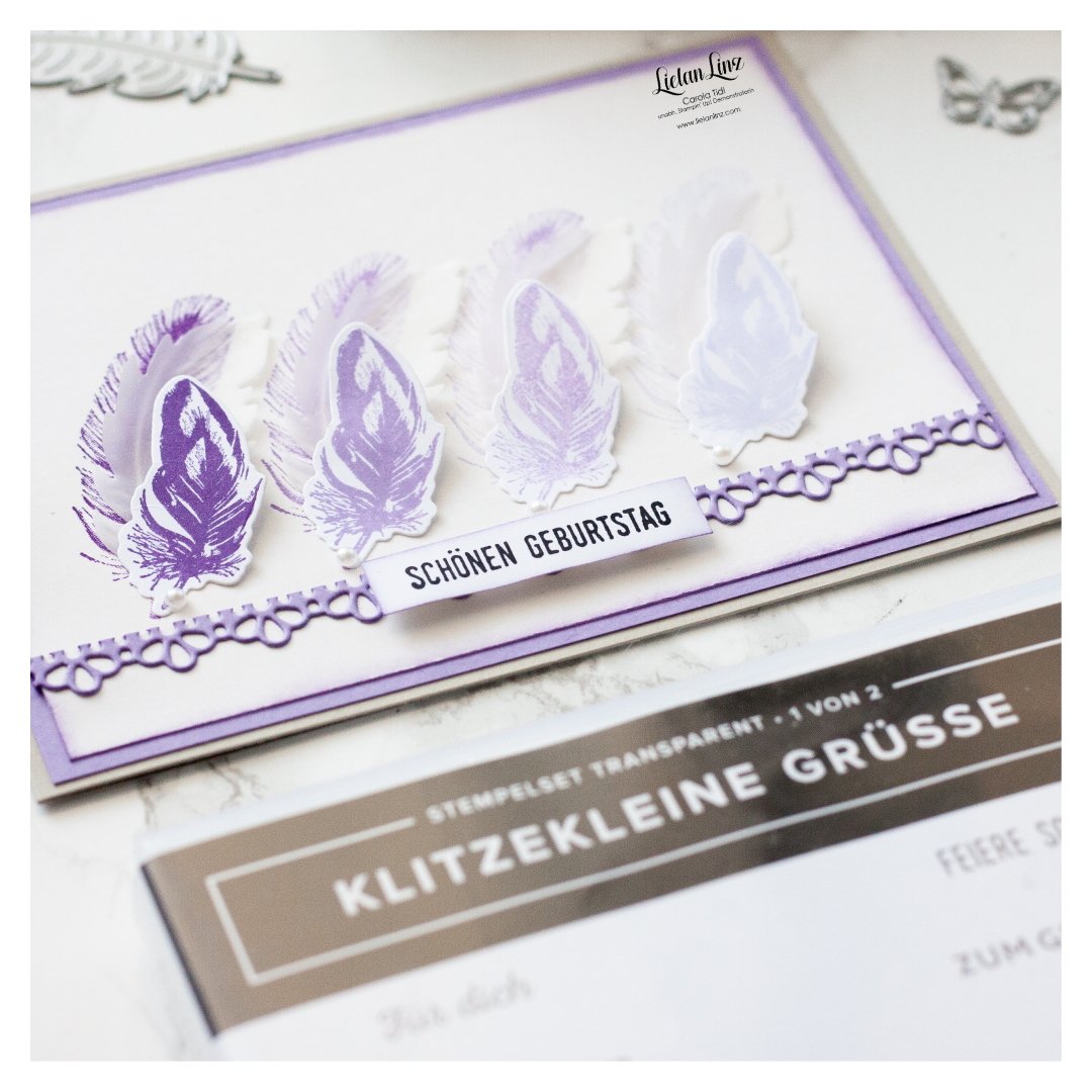 Und weiter geht’s mit Geburtstagskarten .. dieses Mal in den Farben Flieder, Heideblüte und Amethyst. Und „federleicht“ stammt vom Design: Federn, Federn, Federn 😊
