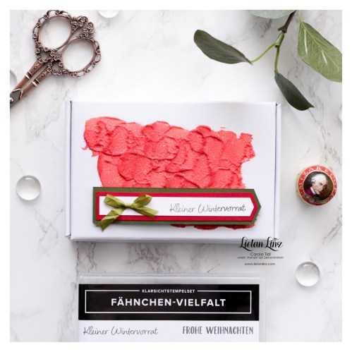 Ich habe mit den Stempeln und den Stanzen und ein wenig Strukturpaste, eine der Paper Pumpkin Mini-Schachteln dekoriert, die ihr im Jahreskatalog von Stampin‘ Up! findet. Wie immer findet ihr alle Materialien am Ende des Blogbeitrages. Aber jetzt erst mal zeige ich euch mein Werk und dann geht’s auch schon direkt zum Video: