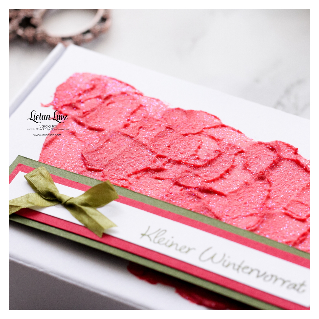 Es funkelt und glitzert und das alles nur durch die Strukturpaste Seidenglanz. Eingefärbt mit Nachfülltinte in Glutrot.