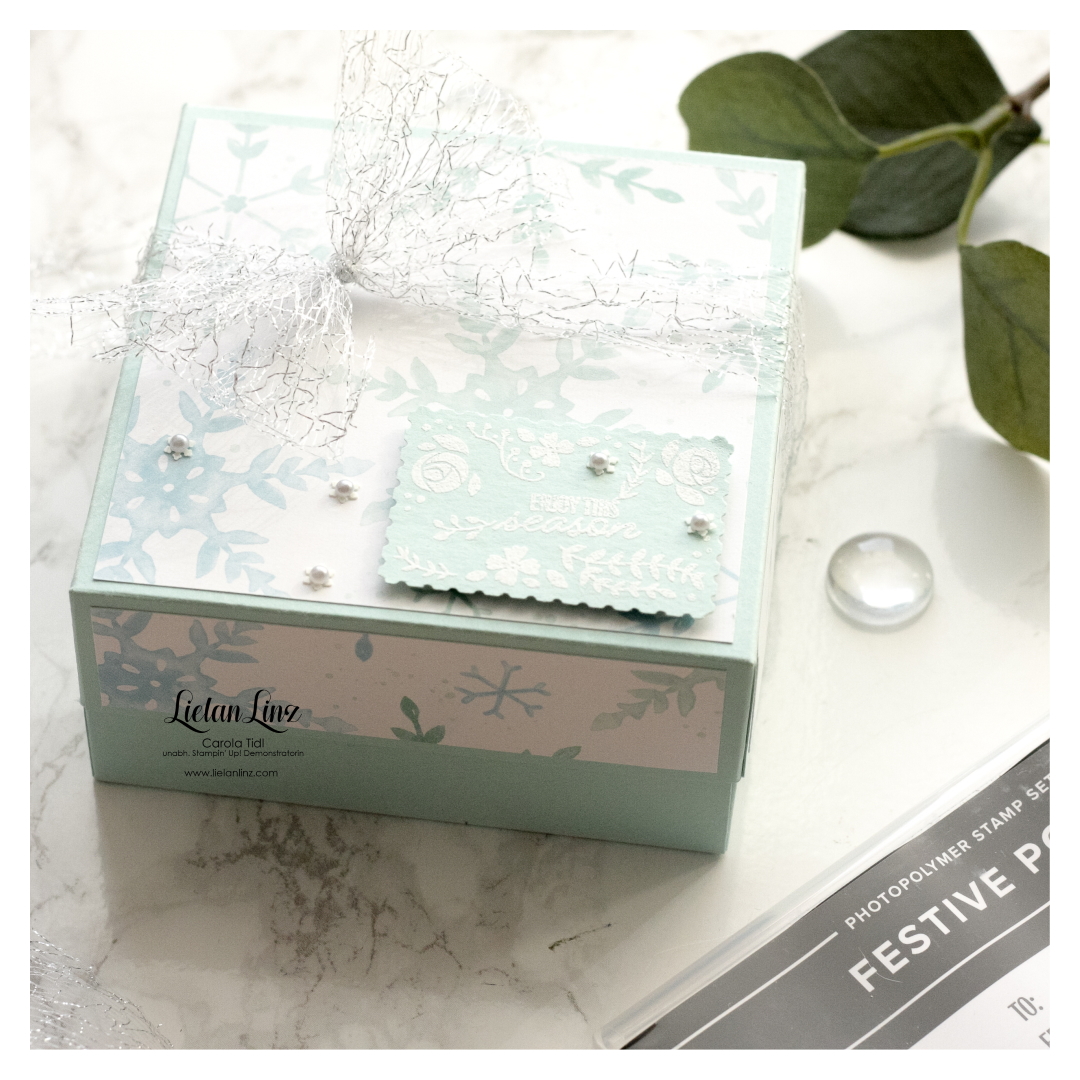 Hauptmaterial ist Farbkarton in Aquamarin und das Designerpapier Schneeflockentraum. Die genauen Maße und Zuschnitte seht ihr wie immer im Video.
