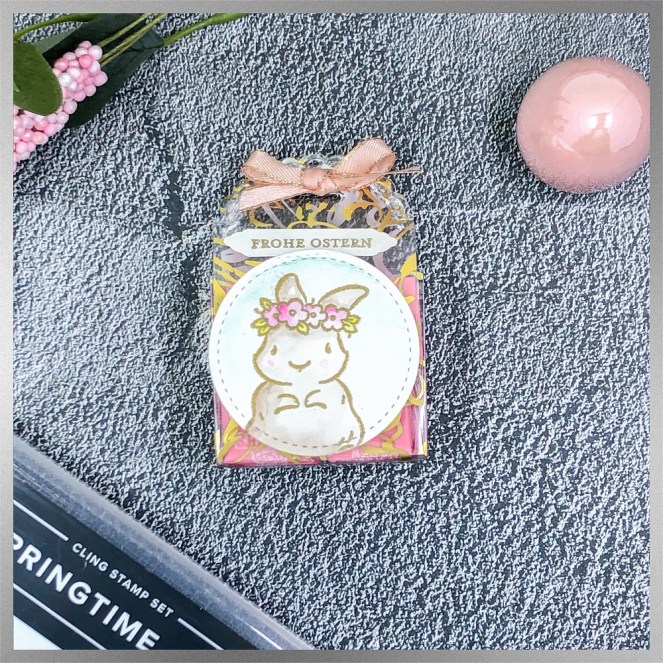 Dekoriert mit dem Häschen aus dem Stempelset Springtime Joy, gold embosst und mit Aquarellfarben coloriert.