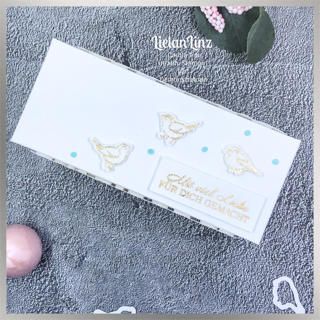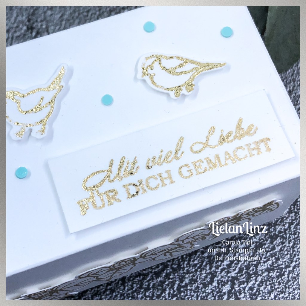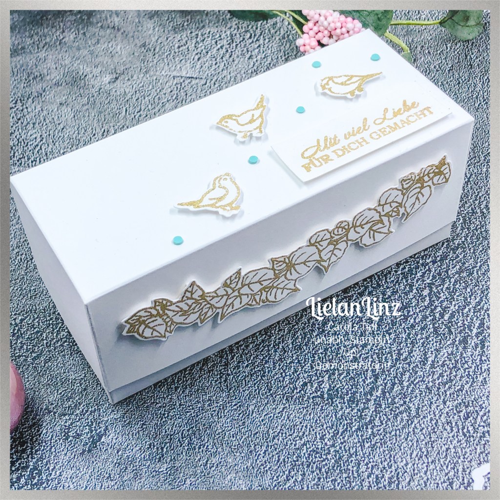 Für diese Box habe ich auf monochrom gesetzt, d.h. nur ganz wenige Farbakzente hinzugefügt. Der Fokus liegt hier auf Weiß und Gold und wie wir das machen, zeige ich euch heute im Live Basteln.