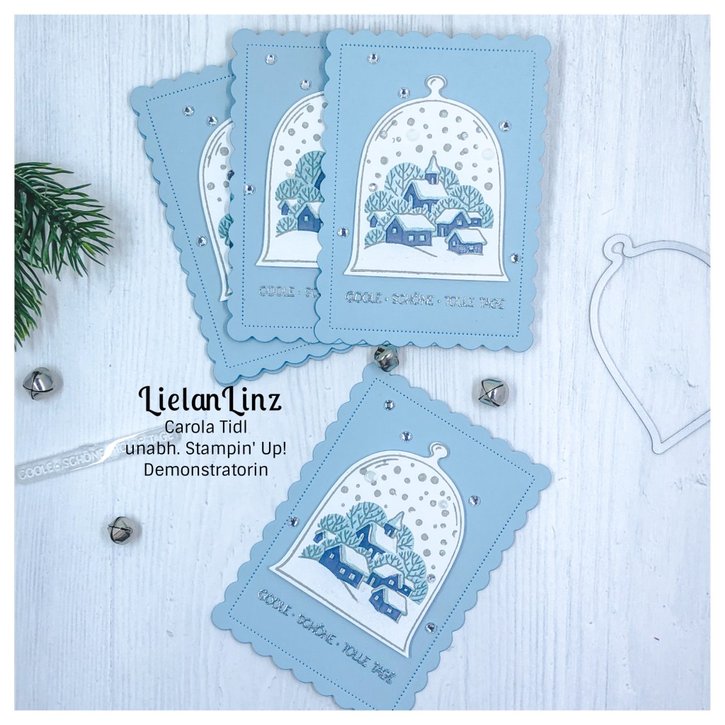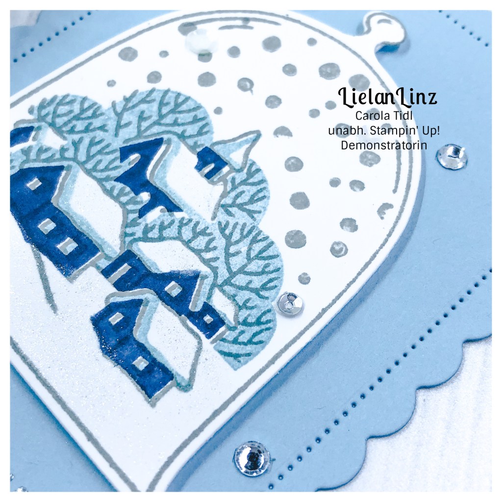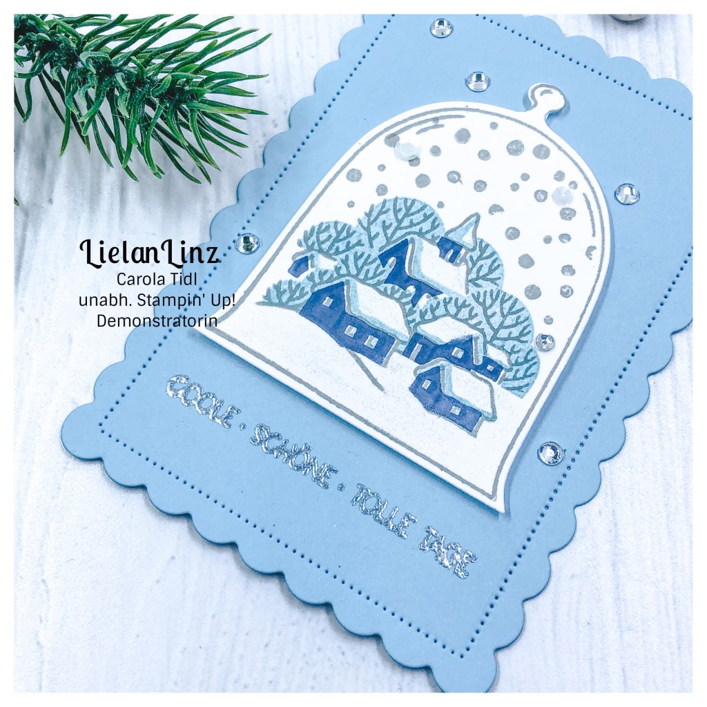 Dieses Mal hab ich mich für eine kleine Winterszene entschieden, gewerkelt mit dem Produktpaket Unter dr Kuppel. Die Farben in kühlen Blautönen gehalten, um die Winterszene noch ein wenig bildlicher zu gestalten. Und was darf bei Winter und Eis und Schnee nicht fehlen? Natürlich ganz viel Bling Bling und Wink of Stella.
