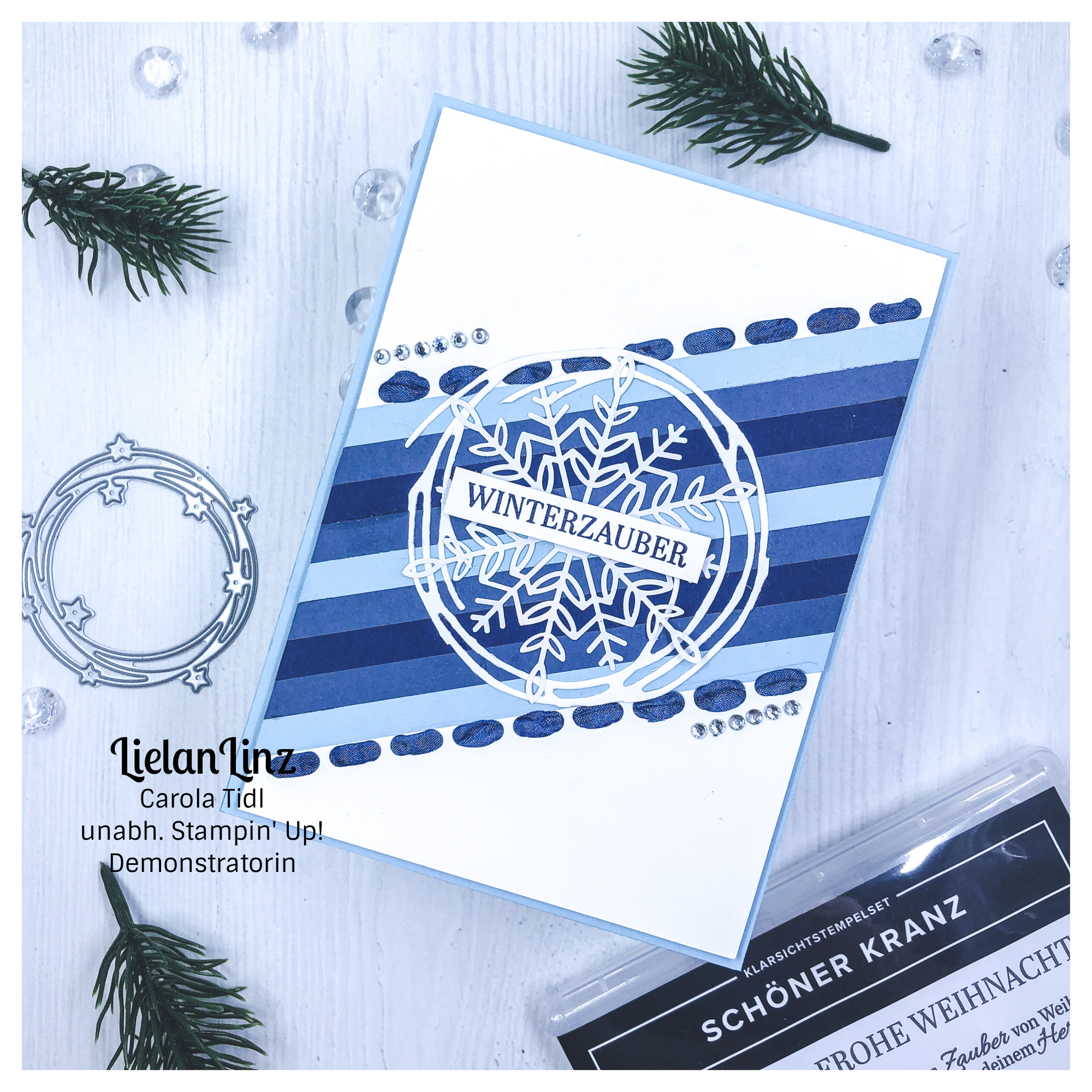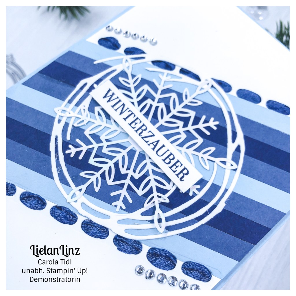 Ich werkle heute mit euch eine kühle winterliche Karte in Blautönen und das (hoffentlich) optische Highlight ist ein Band, welches wir mit den Stampin‘ Blends einfärben werden.