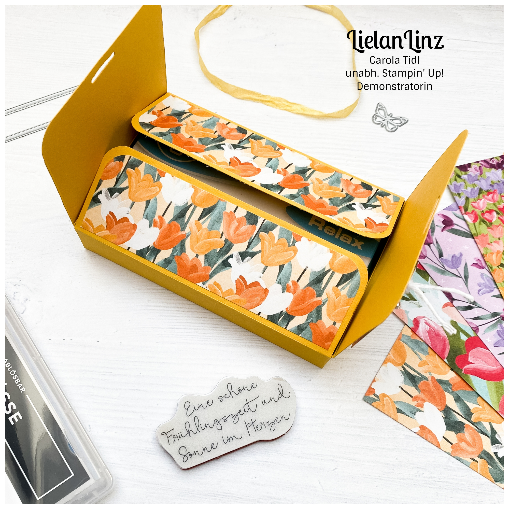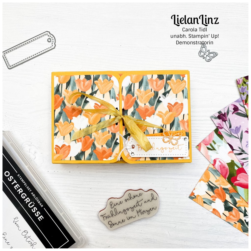 Daher bin ich froh, dass wir uns in diesem Monat für das Thema Frühling entschieden haben und von mir gibt es eine frühlingshafte Box. Gewerkelt mit dem Designerpapier Blühende Felder , denn was passt besser zu Frühling als Tulpen. Der Spruch stammt aus dem Stempelset Ostergrüsse. Sämtliches Material natürlich von Stampin‘ Up!