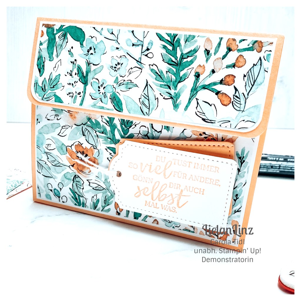 Ich zeige euch eine kleine Papiertüte in einer Umverpackung, die mit Magnet verschlossen wird. Verwendet habe ich die Stempelsets Entspannte Momente, Feierliche Anlässe und Garten Eden … alle Produkte sind von @stampinup und können gerne über mich bezogen werden.