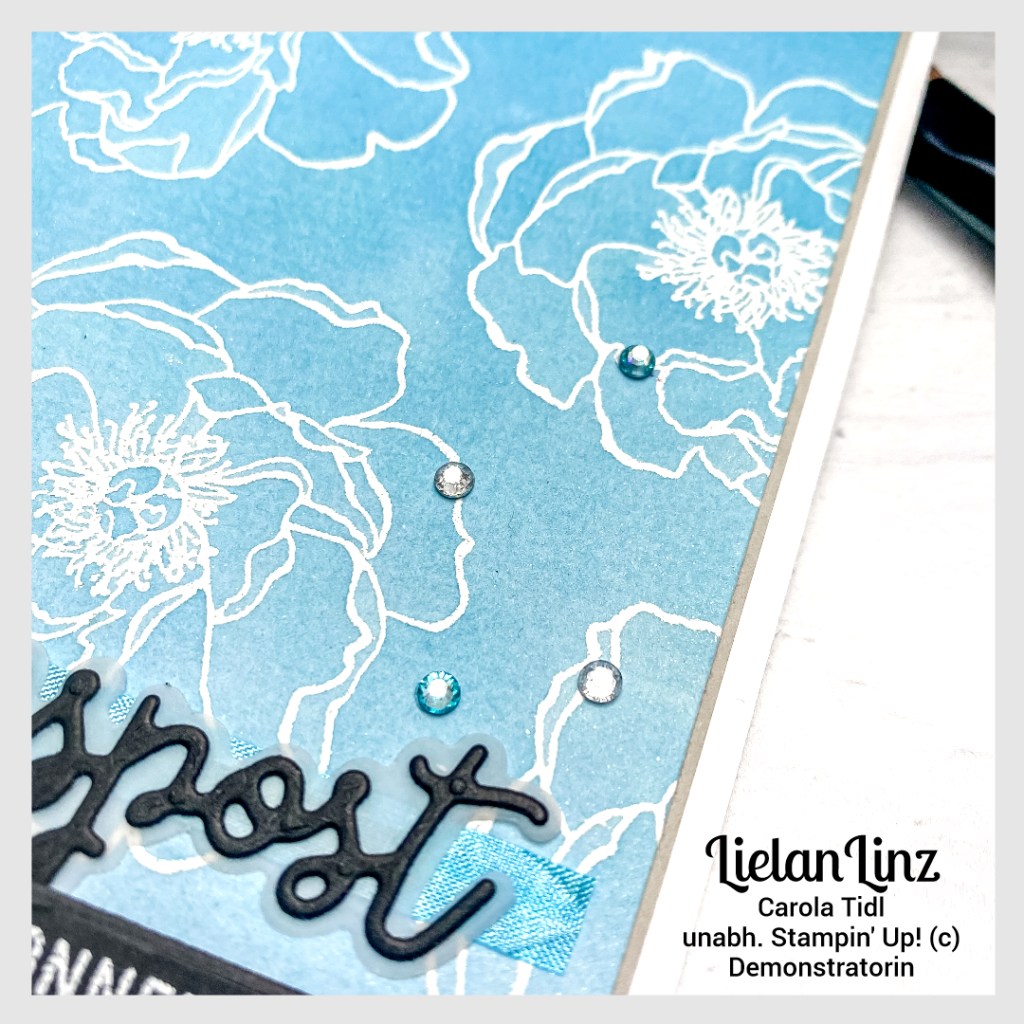 Ich habe dazu im 1. Schritt die Blüten aus dem Stempelset „Alles Glück“ in weiß auf Aquarellpapier embosst. Danach hab ich mit den verdünnten Nachfülltinten einen Ombré-Effekt aufgebracht. Das Papier dann auf ein Stück Saharasand und die Kartenbasis in Grundweiß extrastarkt geklebt.