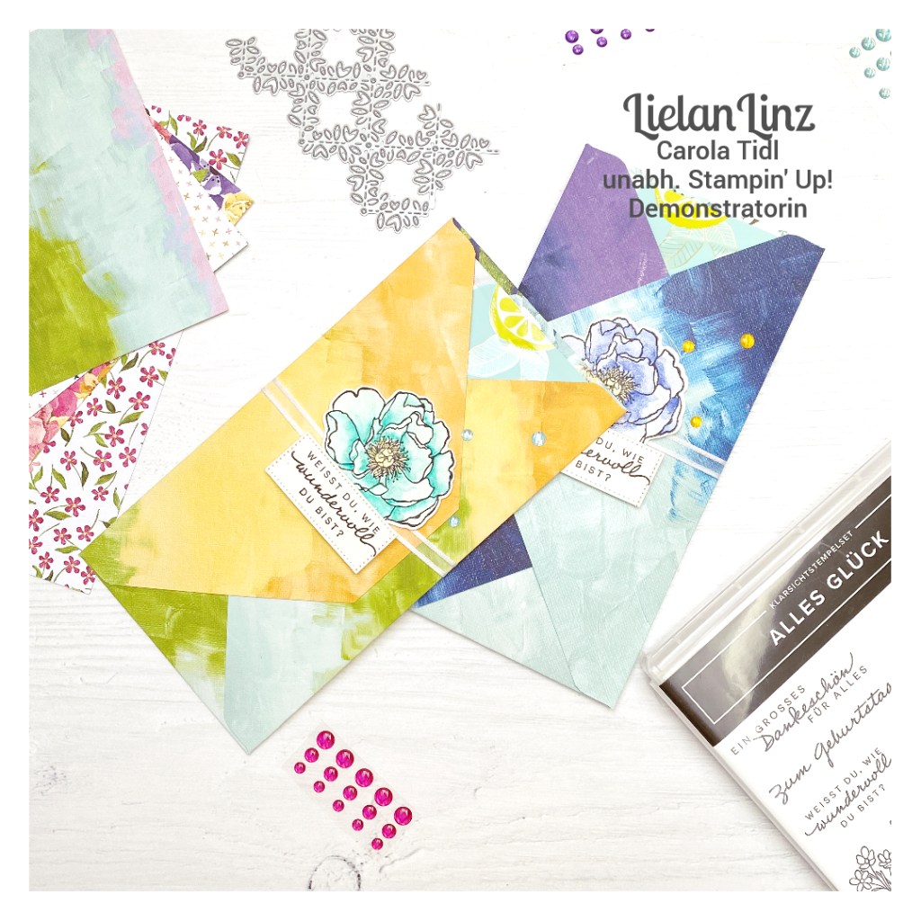 Was ich auch mal wieder hervorgeholt habe für dieses Projekt, sind meine Aquarellstifte von Stampin‘ Up! Die sind so toll in der Verarbeitung und die Farben echt intensiv, aber wie letzte Woche schon bei meinem LielanLinz Live erwähnt, bin ich viel zu selten echt künstlerisch unterwegs – ich kann halt einfach am besten verpacken.