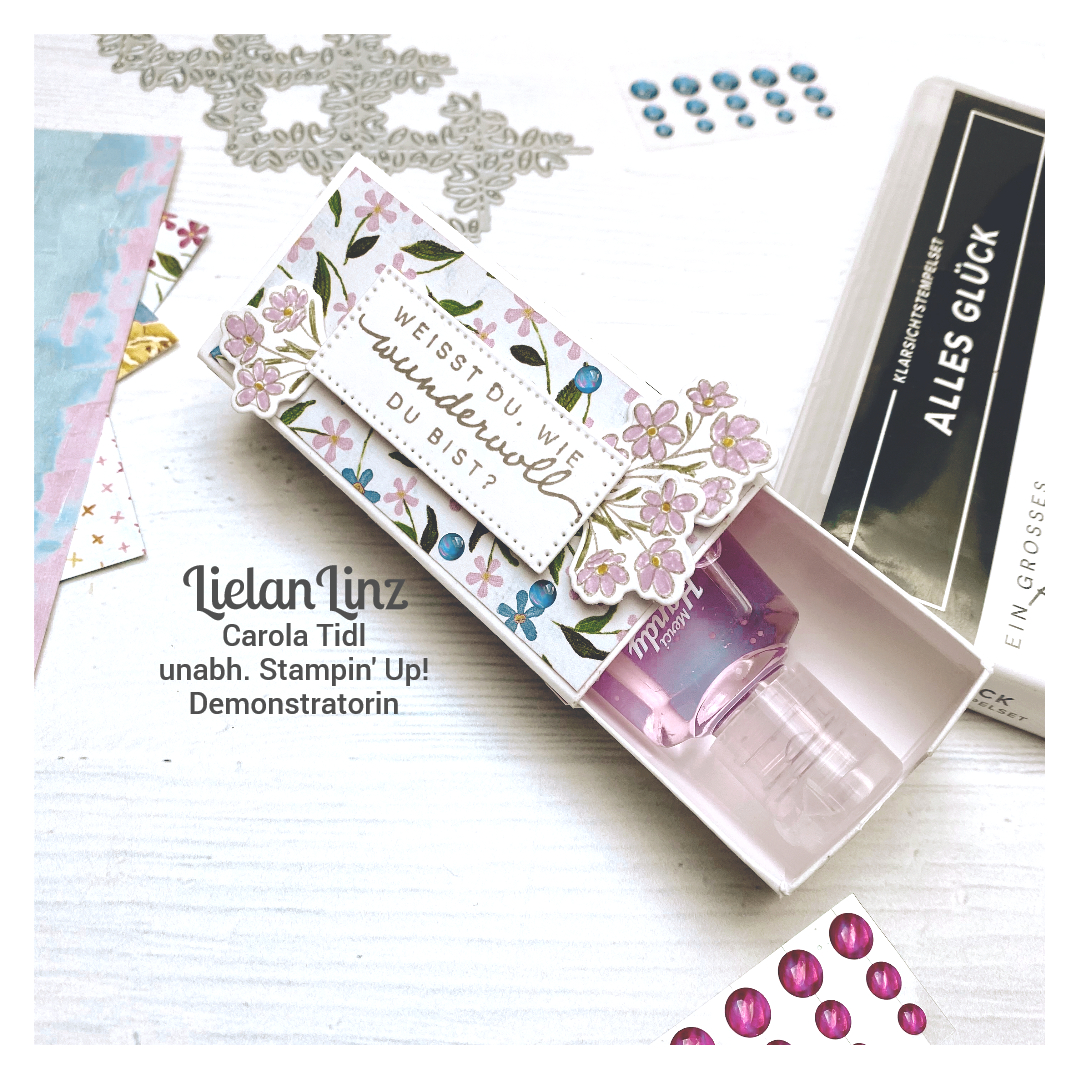 Eine kleine Match-Box mit Handdesinfektionsgel steht heute auf dem Plan, denn auch das brauchen wir (leider nicht nur) im Sommer. Ich weiß ja, dass manche lieber sprühen und wieder andere eben dieses Gel bevorzugen – aber wir Bastler schauen halt beim Einkauf immer gleich auf Farbe, Form und Größe – so dass wir gut verpacken können. Und dieses Gel von Bath & Body Works (Markennennung | selbst gekauft) passt farblich extrem gut zum Produktpaket Farben des Glücks von Stampin‘ Up!