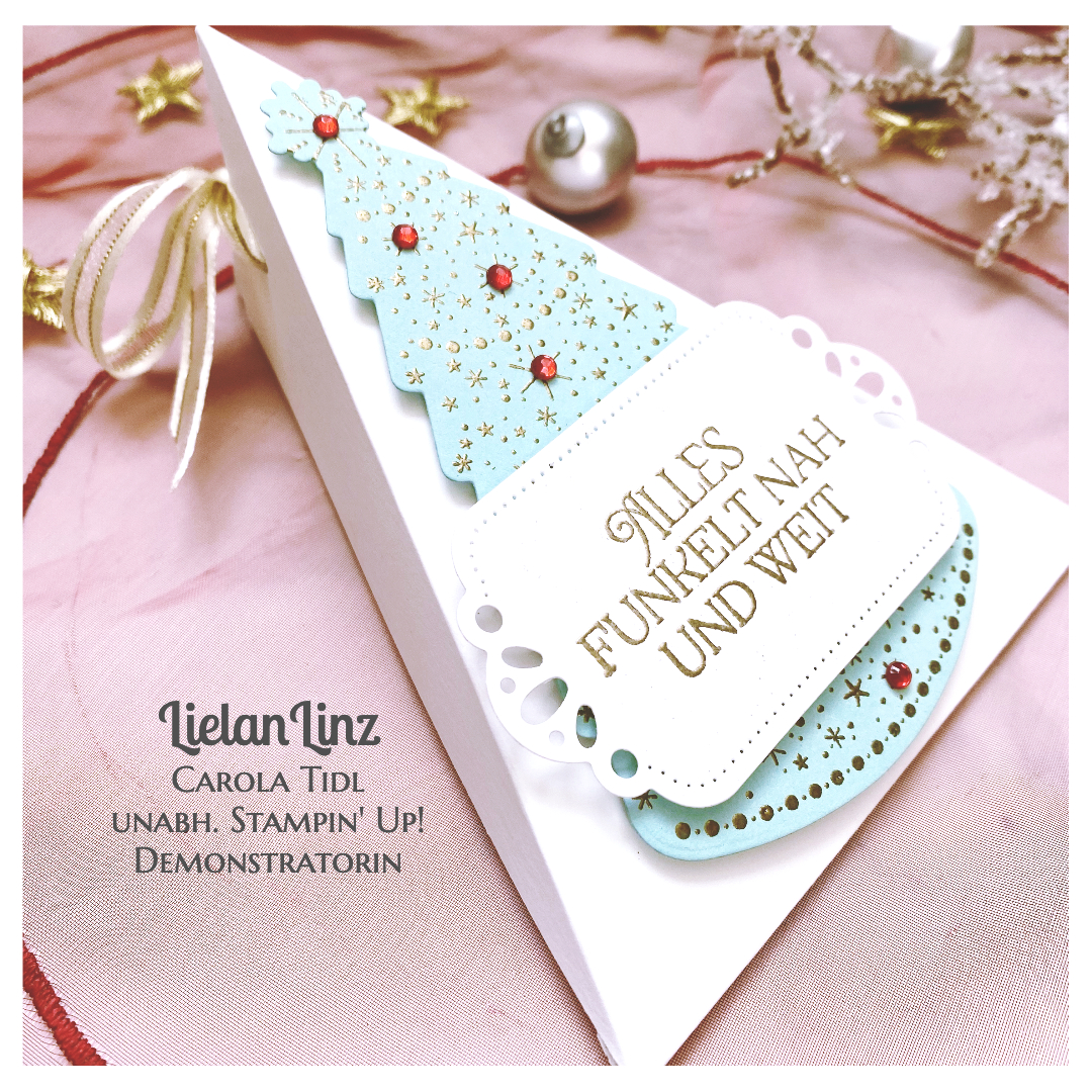 Ich darf euch heute mein 1. Projekt zeigen, nämlich eine winterliche weihnachtliche Dreiecksbox. Dekoriert habe ich mit dem Weihnachtsbaum, den ich in Gold auf Aquamarin embosst habe. Das ist zwar keine typisch weihnachtliche Farbe, aber in Kombination mit Gold und Rot einmal etwas anderes .. oder was meint ihr?