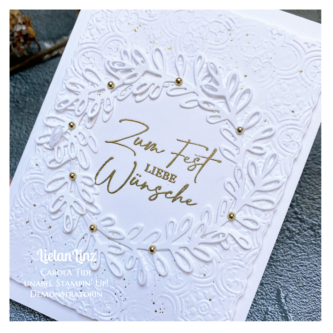 Für diese Karte kam der Prägefolder „Fliesen im Antik-Look“ zum Einsatz, genauso wie das Stempelset „Feiertags-Klassiker“ mit den dazugehörigen Stanzformen. Die Stanzformen selbst sind kein Kranz. Aber den könnt ihr ganz einfach machen, in dem ihr die Blätter mehrfach ausstanzt und im Kreis herum aufklebt.