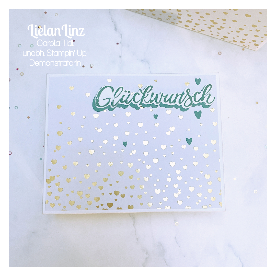 Das Designerpapier ist das Gratis-Papier aus der Sale-a-bration, nennt sich „Goldige Muster“ und das könnt ihr euch bei 60 EUR Bestellwert kostenlos mitbestellen.