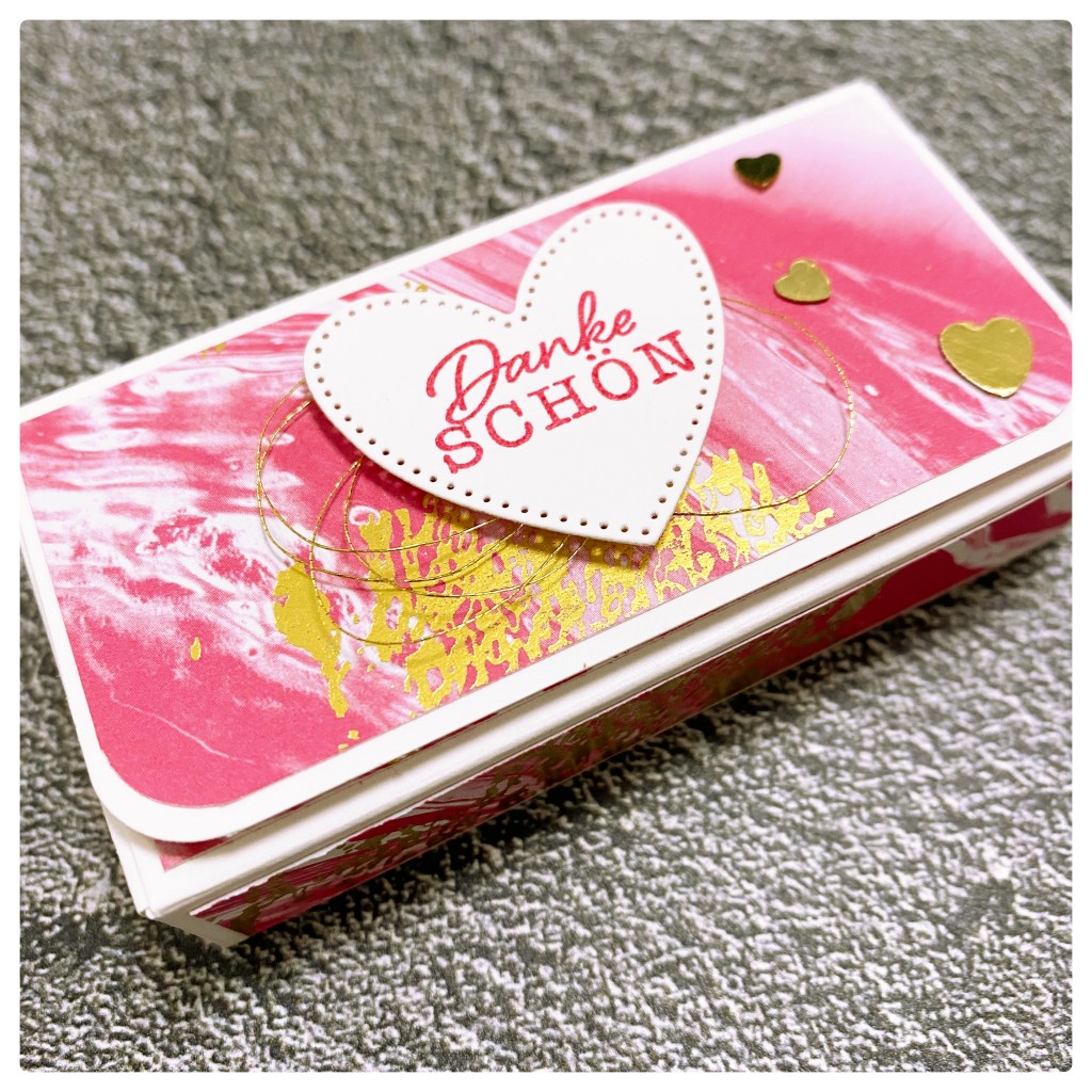 Unter anderem ist diese Box für 2 Teelichter entstanden .. mit dem Stempelset „Sortierte Grüße“, dem Designerpapier „Marmorierte Eleganz“ und den dazugehörigen Stanzformen „Elegante Herzen“.