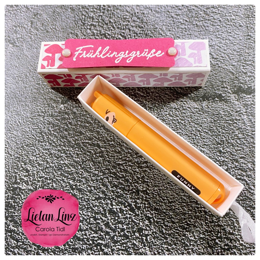 Diese kleine Box hat die Maße 7.5 x 1.5 x 1.5 cm und darin habe ich einen kleinen Leuchtstift verpackt, die ich vor kurzem in meiner Lieblingstrafik, die auch gleichzeitig meine Paketannahmestelle ist, gefunden habe.