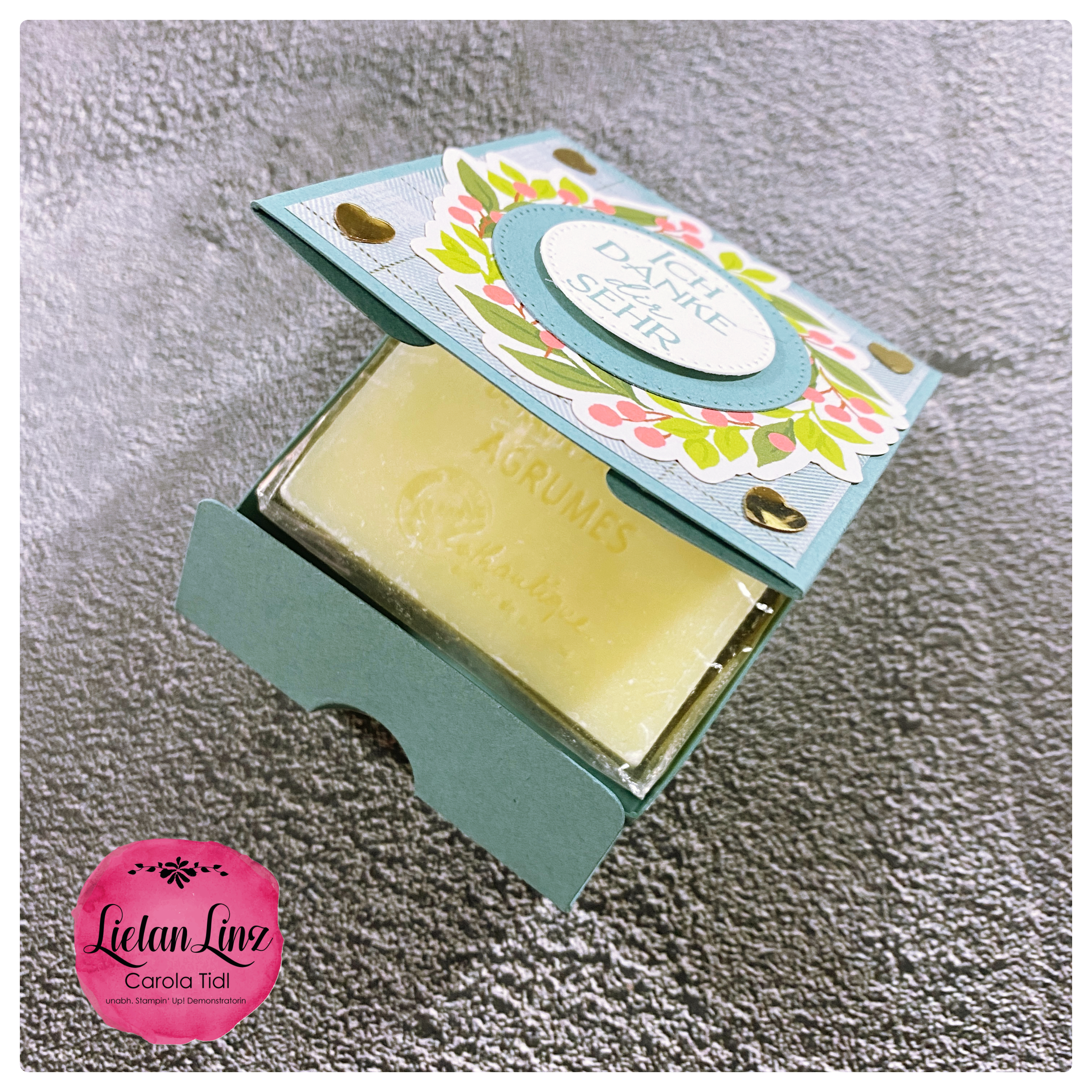 Verpackt habe ich hier Seife, die sich farblich an das Designerpapier Zeitlos kariert und an die Deko-elemente aus dem Set Zierelemente-Mix Allerlei Blüten perfekt anpasst.