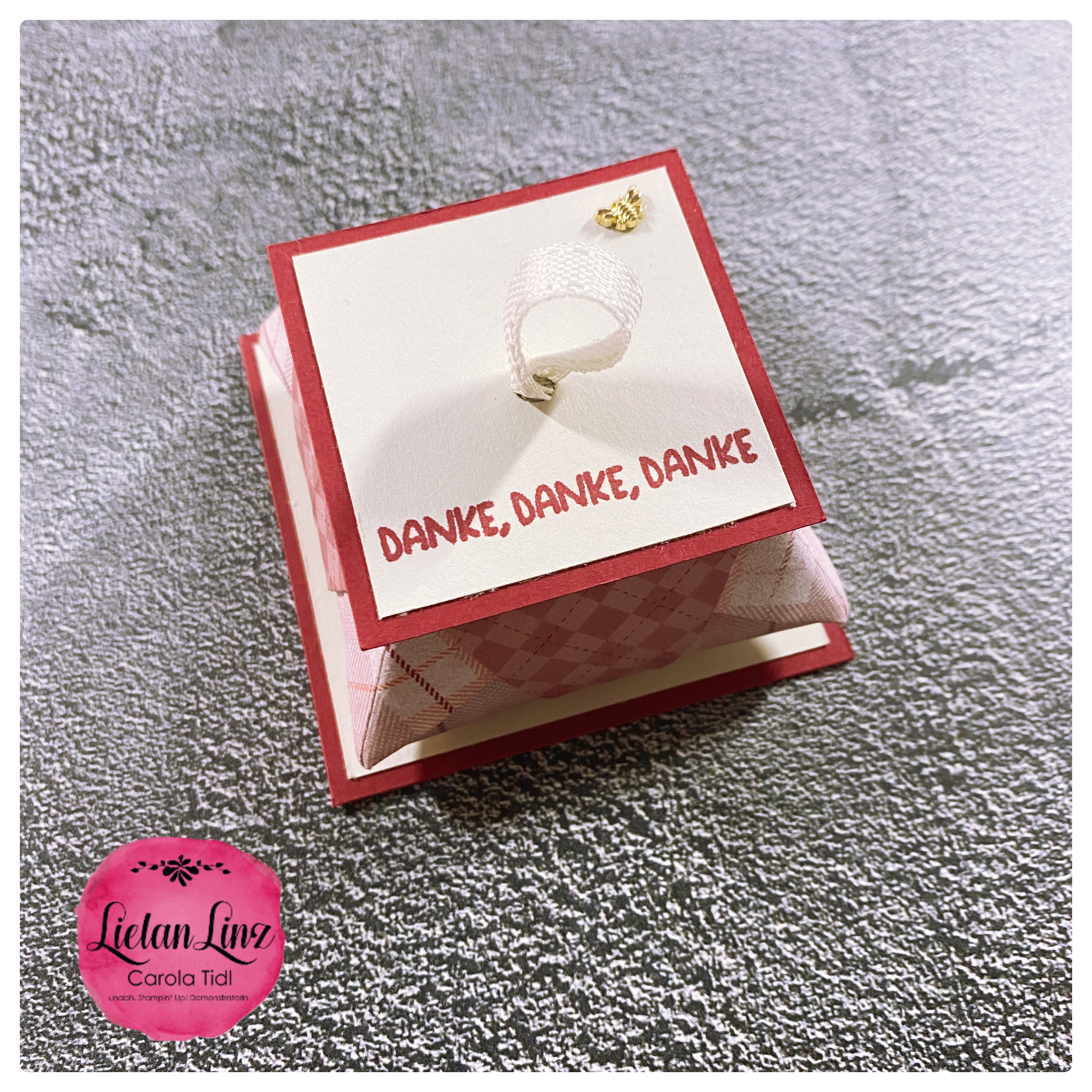 Die fertige Box hat an der breitesten Stelle 6.5 cm und ist 3.5 cm hoch. Ihr benötigt für diese Größe Papier in 6×6″ oder 15.2 x. 15.2 cm – ich habe mich für das Designerpapier Zeitlos kariert von Stampin‘ Up! entschieden.