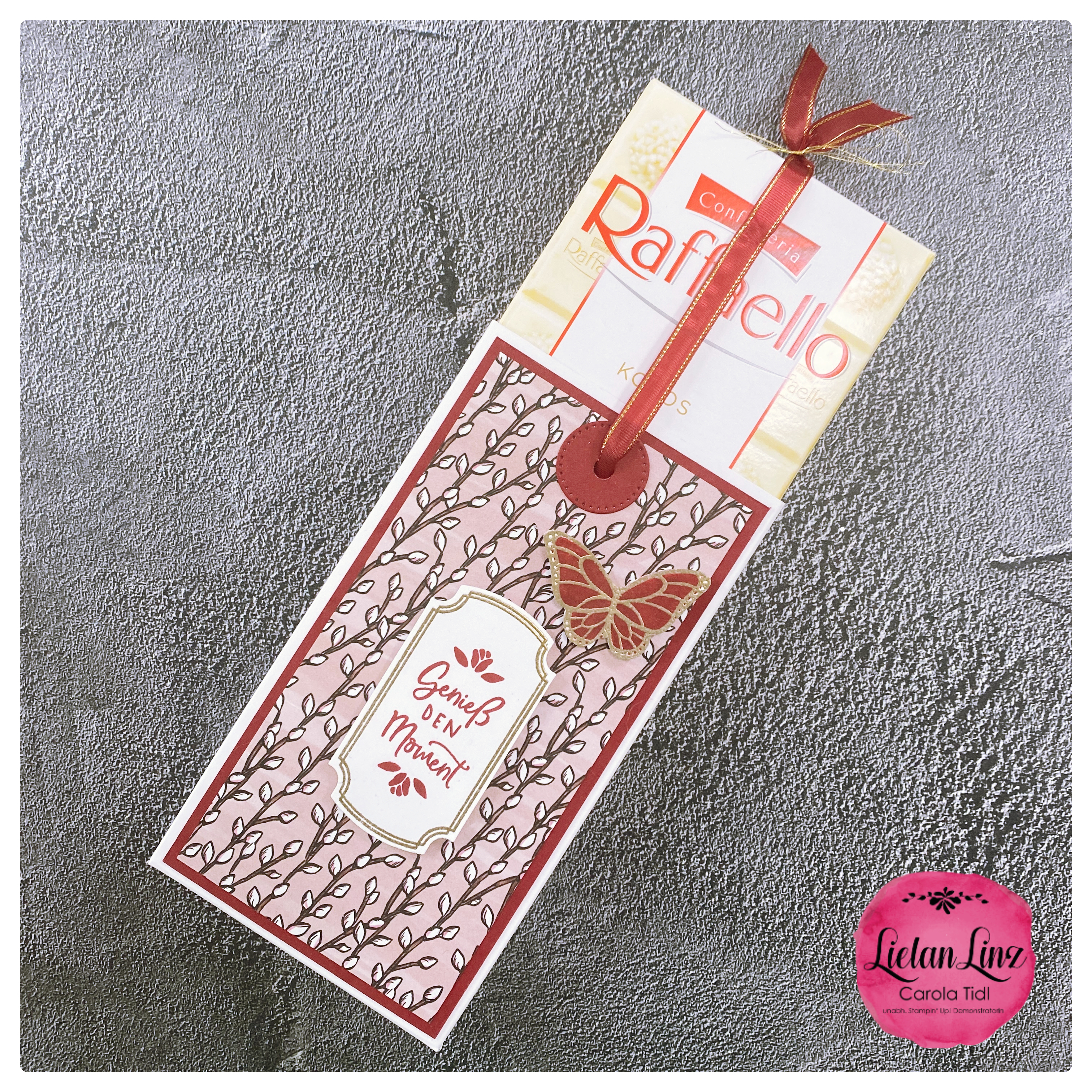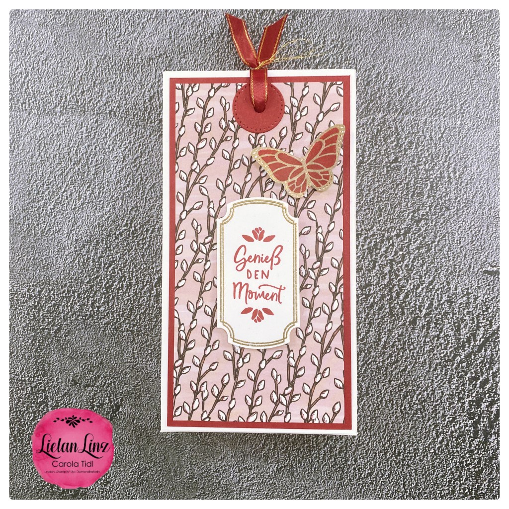 Das heutige Projekt zeigt eine Schokoladen-Ziehverpackung, verziert mit einem Schmetterling, zarten Mustern und dem Spruch „Genieß den Moment“. Eine perfekte kleine Geschenkidee!