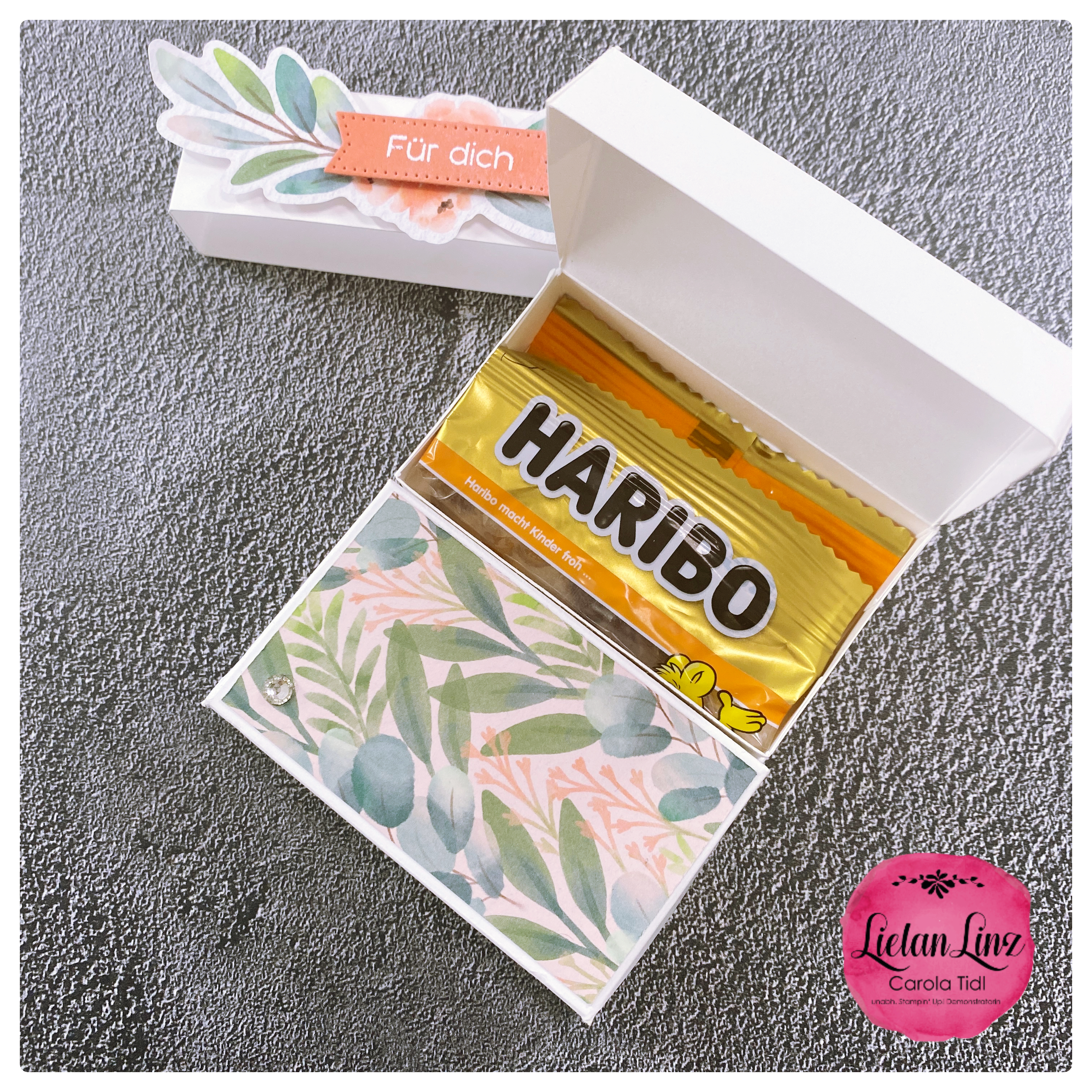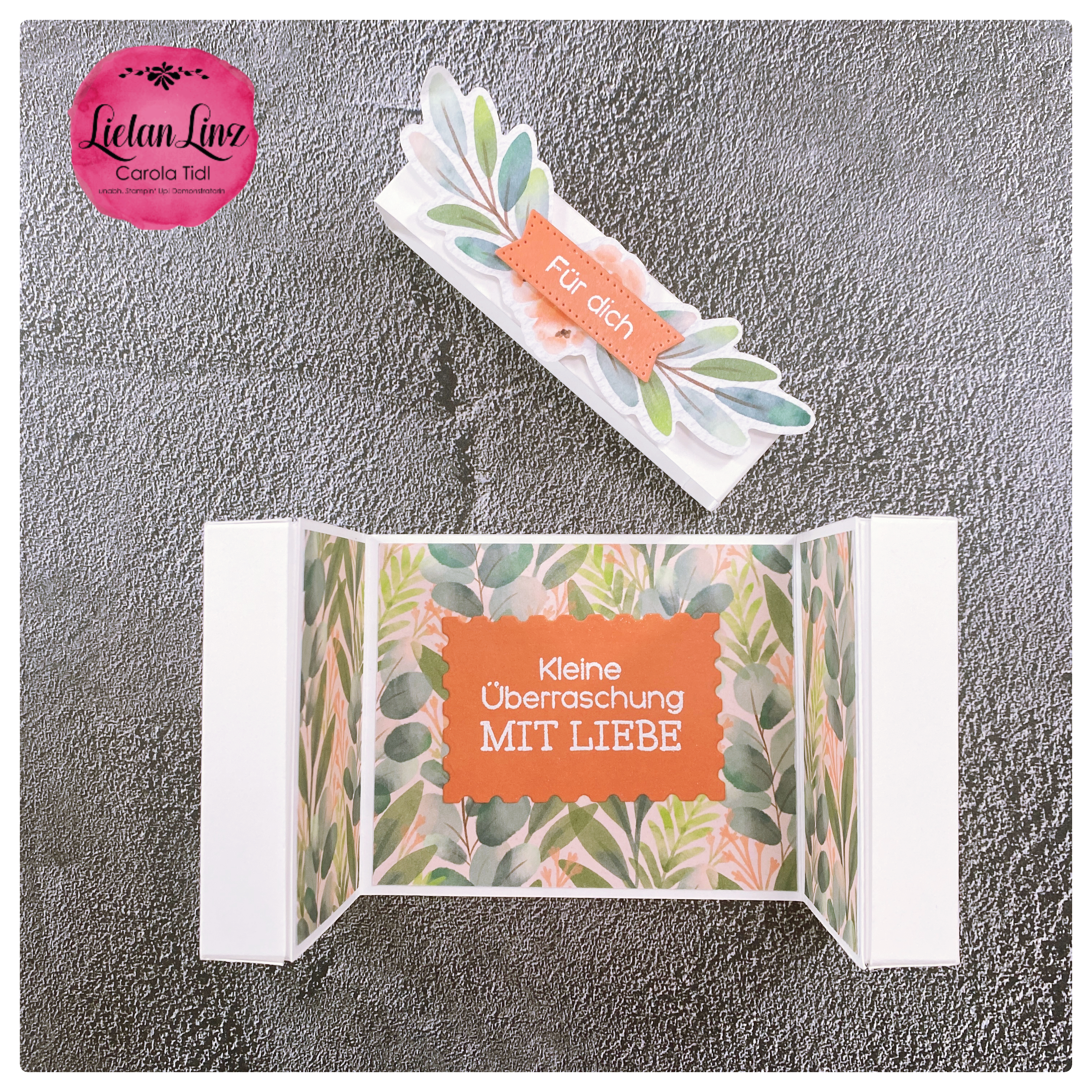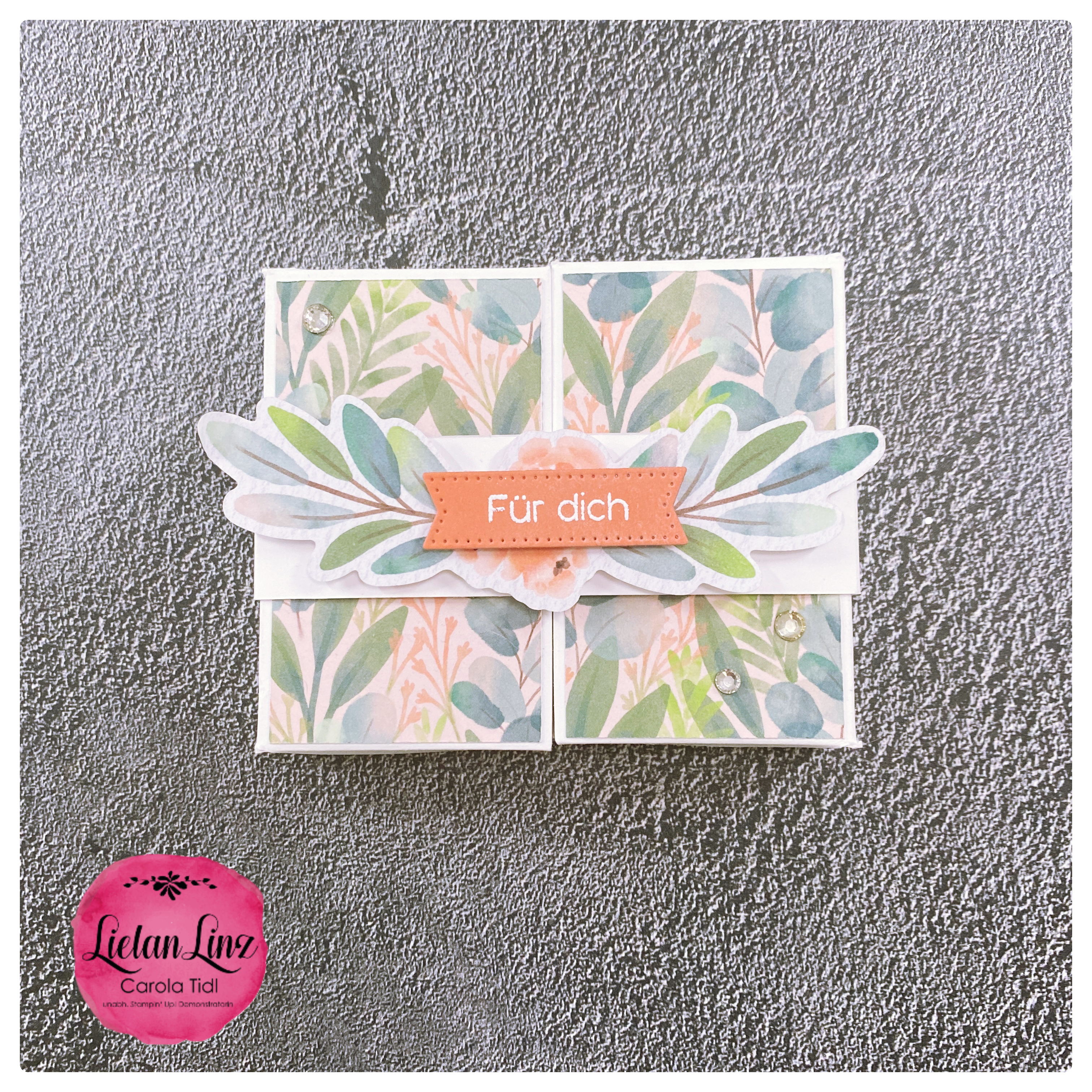 Das heutige Projekt zeigt eine elegante Klappschachtel mit floralen Mustern und dem Schriftzug „Für dich“.