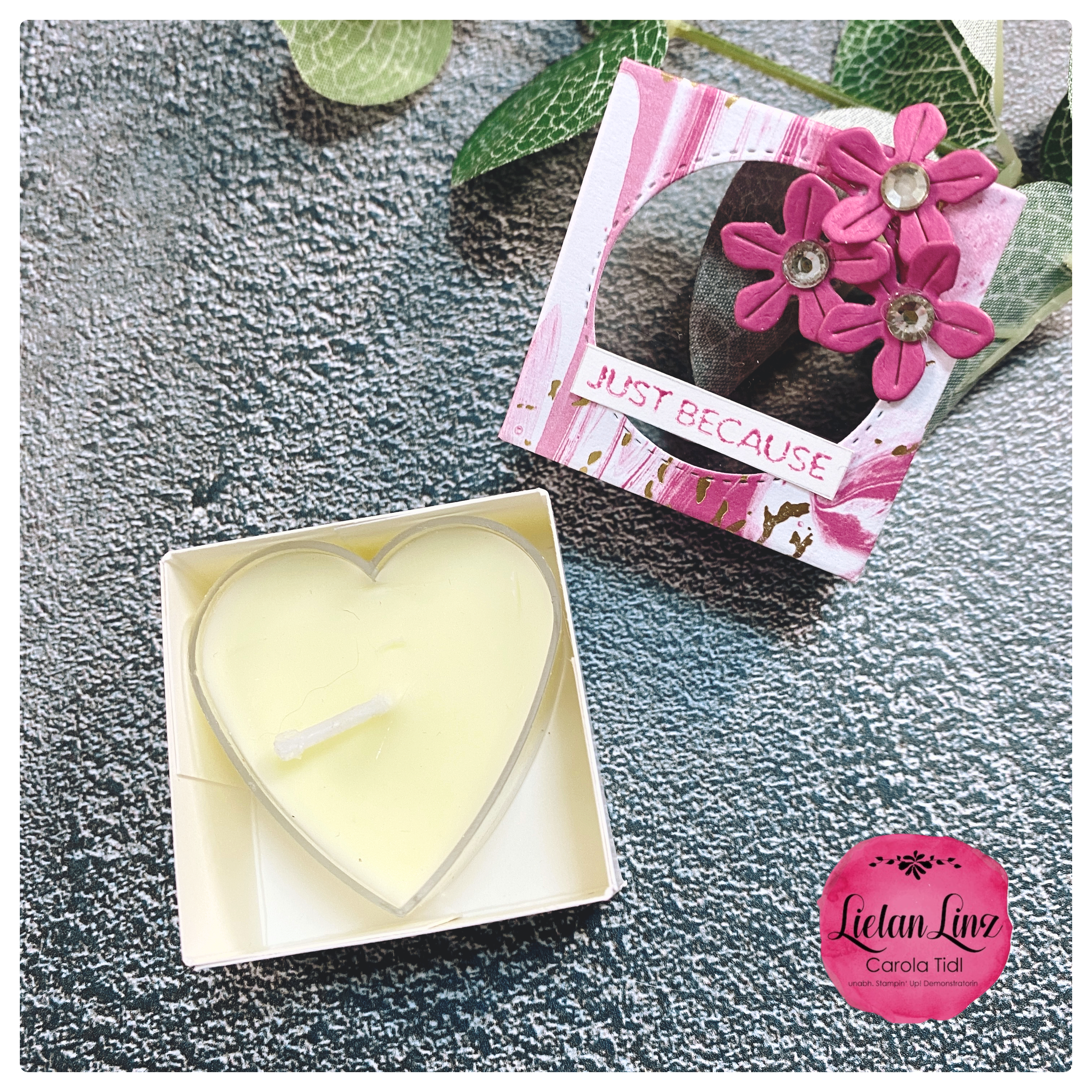Passend zur Verpackung und für den bevorstehenden Valtentinstag eine kleine Kerze in Herzform.