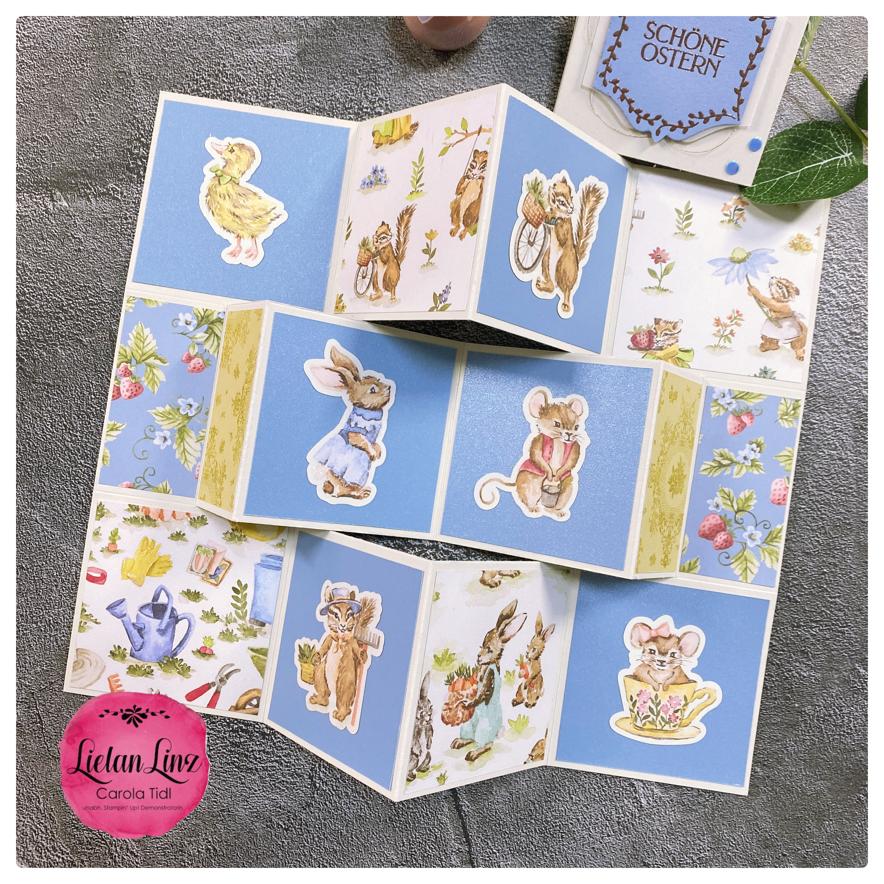 Eine Karte aus meiner Nachmachkiste wurde heute nachgewerkelt. Für Ostern, mit ganz vielen zarten Frühlingsmotiven – wenig zu stempeln, weil das Designerpapier Märchenhafte Gefährten vorgestanzte Motive enthält.