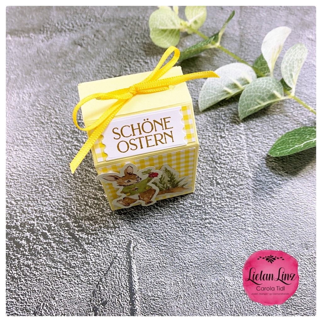 Ein Milchkarton mit flachem Deckel .. eine andere Form des üblichen und durchwegs bekannten Milchkartons. Und mit der Deko habe ich es mir wieder einfach gemacht und die fertigen Stanzteile aus dem Designerpapier „Märchenhafte Gefährten“ von Stampin‘ Up! verwendet.