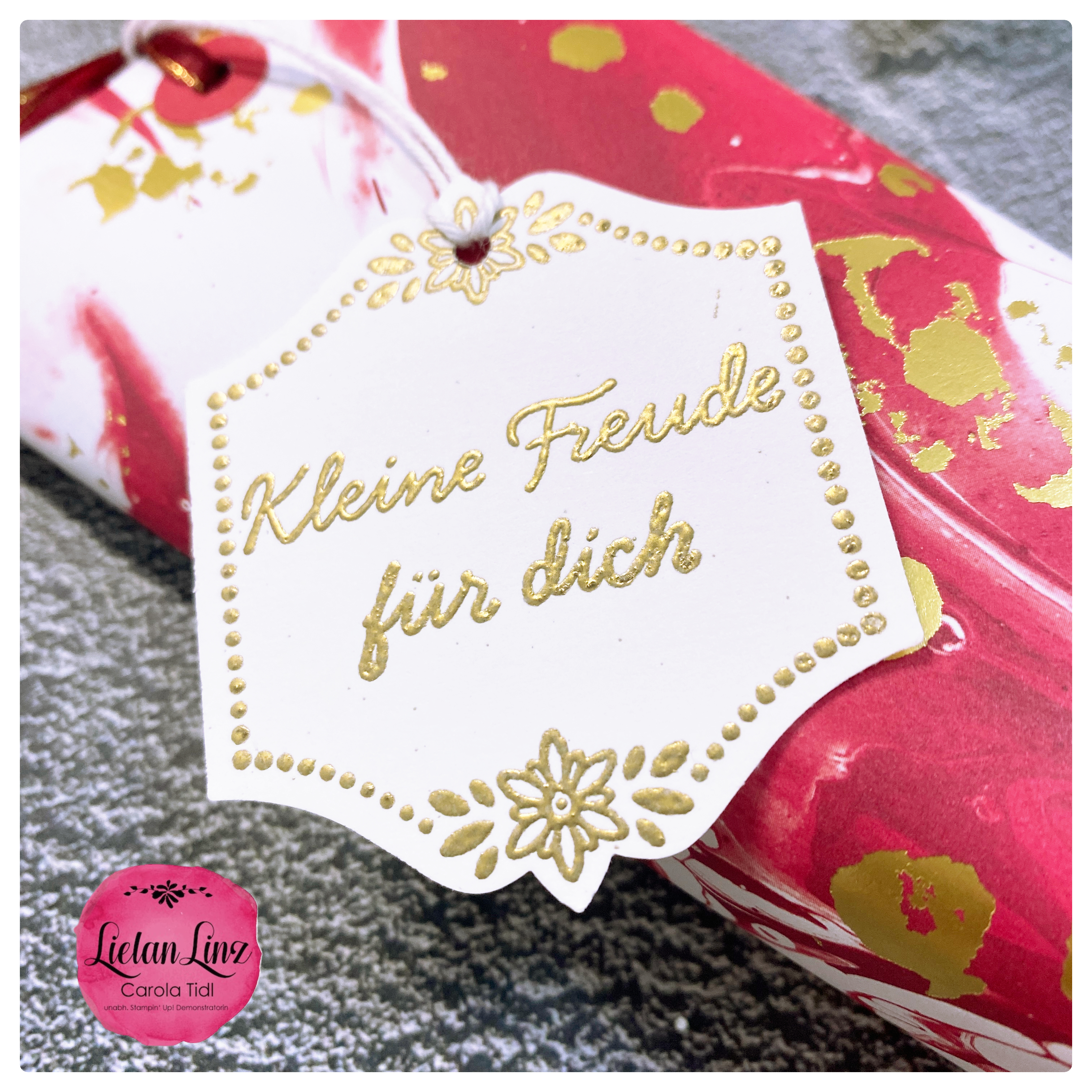 Wieder einmal habe ich eine Idee aus meiner Nachmachkiste nachgewerkelt. Dieses Mal von Elke, die uns im heurigen Team Adventkalender ebenfalls eine tolle Handcreme geschenkt hat. Die Idee habe ich mit den aktuellem Designerpapier Marmorierte Eleganz von Stampin‘ Up! nachgewerkelt.