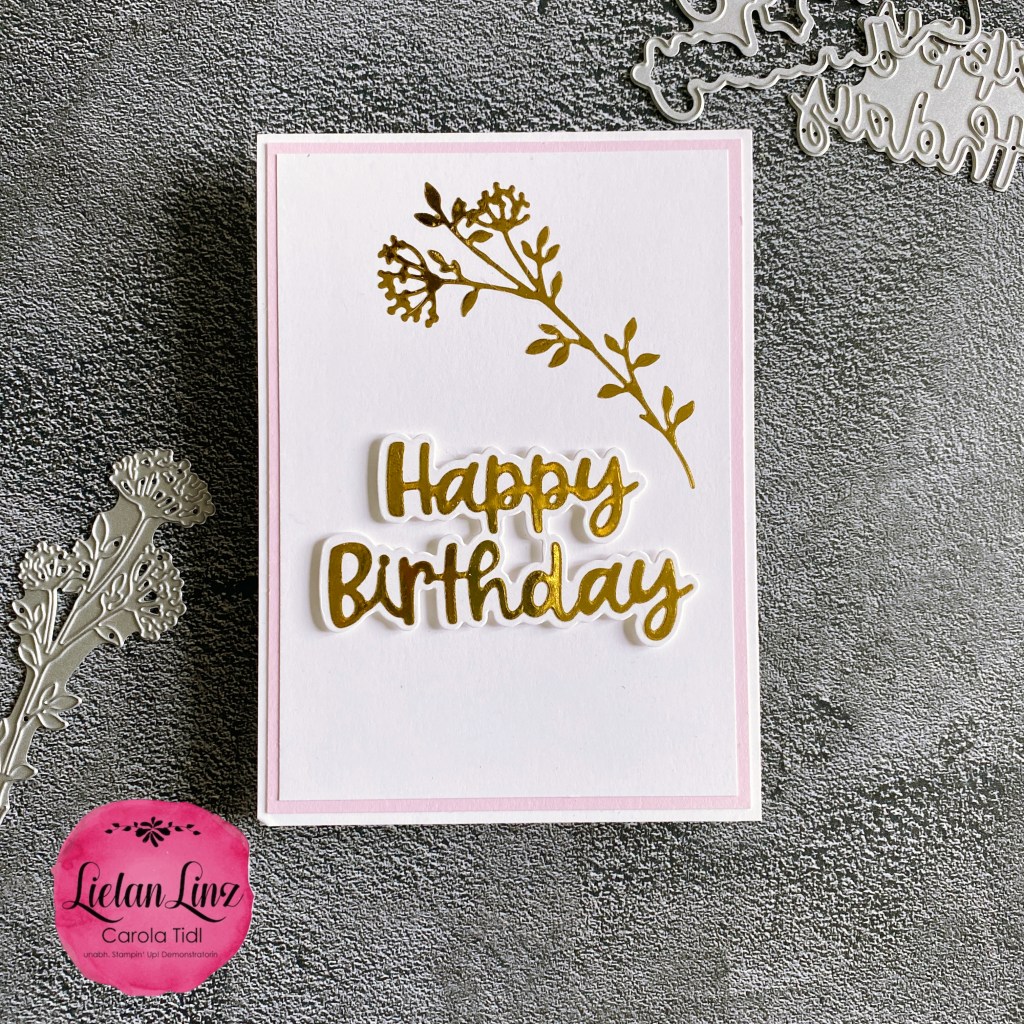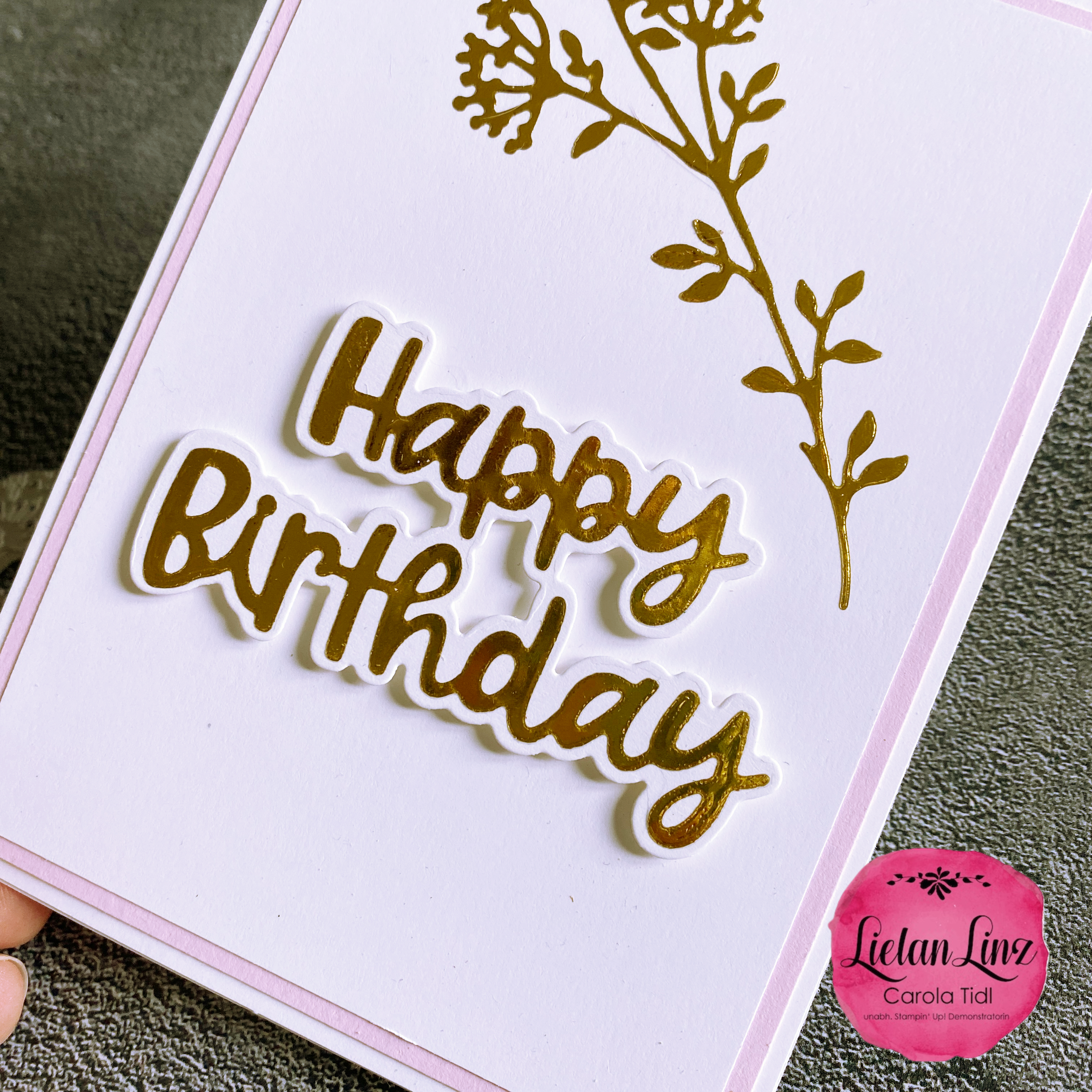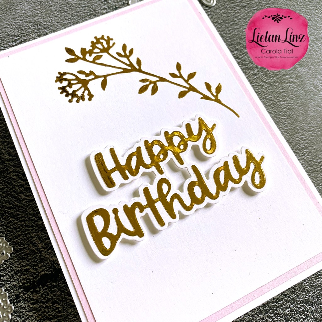 Wie schon bei meiner Osterkarte vom 6. Jänner (Link) habe ich auch bei dieser Karte mal wieder meine geliebte Heißklebefolie verwendet. So glänzt der Schriftzug und auch die Blume in einem satten Gold. Die restliche Karte ist dafür ziemlich basic gehalten.