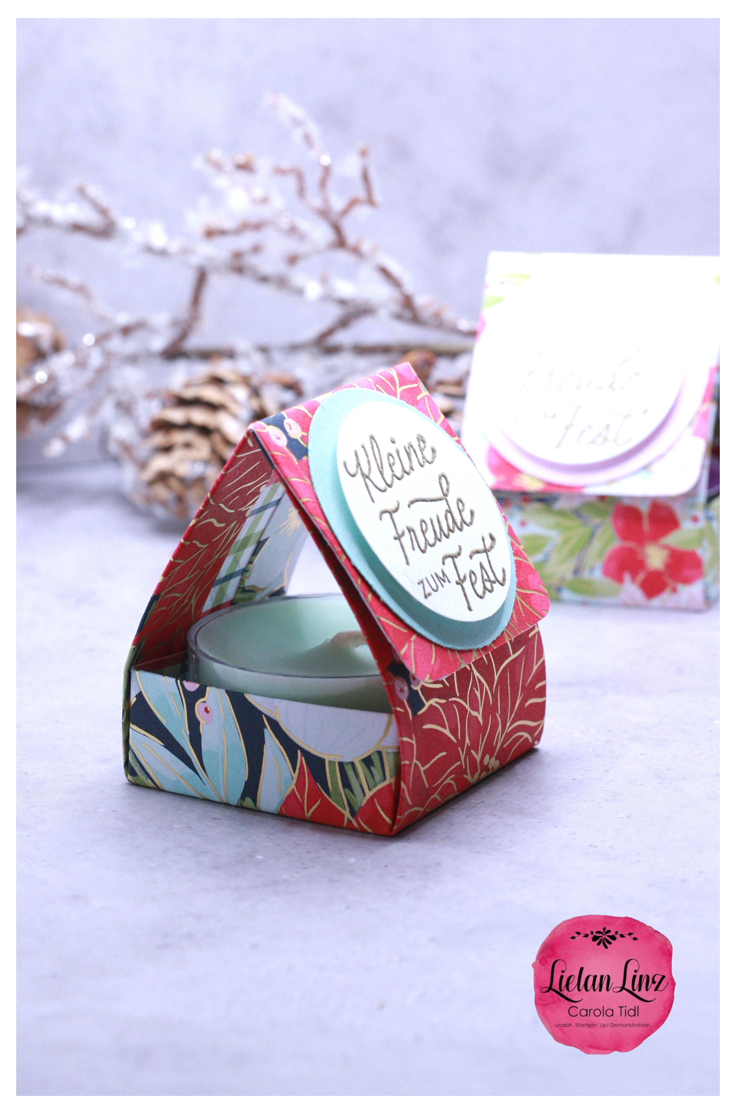 Eine kleine Dreiecksbox, die mit einem Magnet verschlossen wird – passend für ein Teelicht.