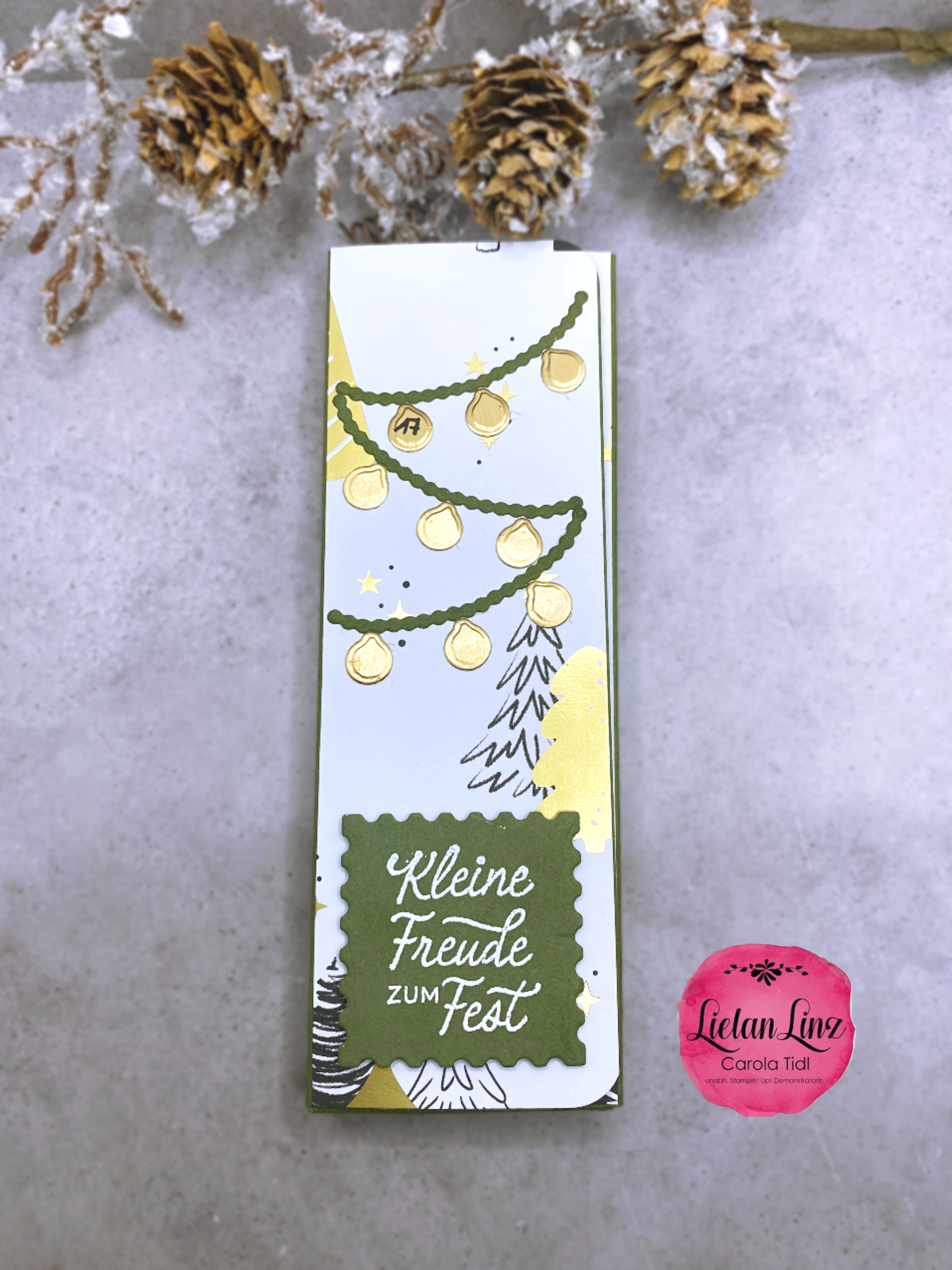 Von mir kommt eine kleine Schachtel mit Einschlag und Magnetverschluss. Dekoriert mit den dem Spruch „Kleine Freude zum Fest“ aus dem Stempelset Freude zum Fest.