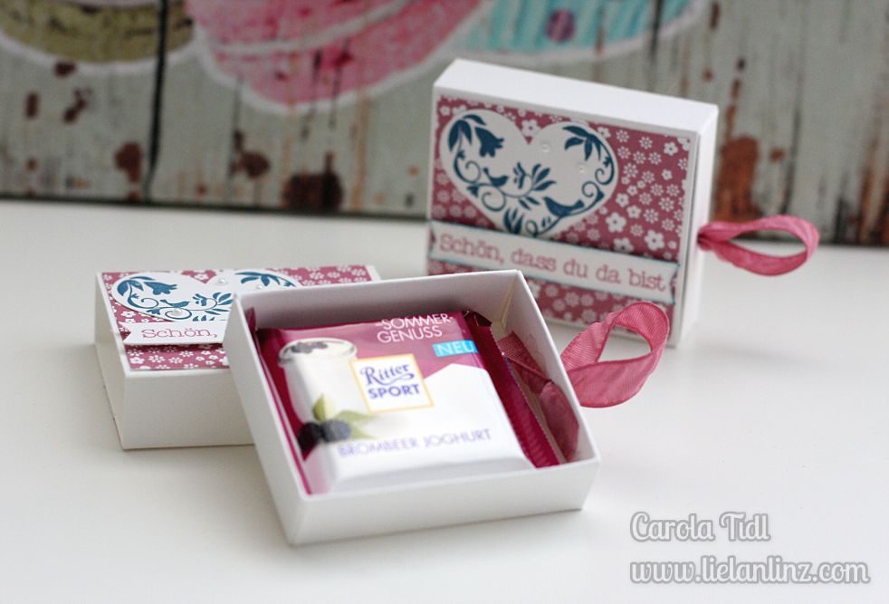 Es war mal wieder an der Zeit ein paar Workshop-Goodies vorzubereiten und als ich vor kurzem die neue Sommeredition von RitterSport entdeckt habe, wusste ich gleich: die müssen verpackt werden. Für die Schachtel benötigt ihr extrastarken Farbkarton in Flüsterweiß (#140490) mit den Maßen 10,8 x 11,8 cm. Gefalzt wird im Kreis bei 1,4 und 2,9… Weiterlesen Mini-Ziehverpackung ~ Matchbox | Stampin‘ Up!
